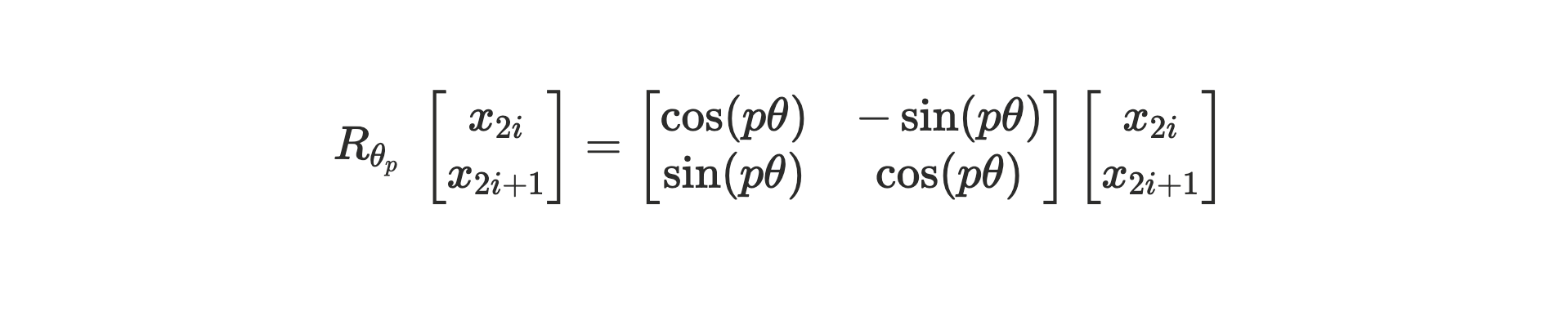 RoPE의 핵심 수식: 토큰 임베딩에 위치 p에 따른 회전 행렬을 적용해, 내적 계산 속에 상대적 거리 정보를 주입합니다. 출처: ⓒ deep daiv. |