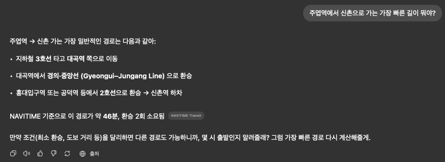 ChatGPT에 주엽역에서 신촌 가는 방법을 물었을 때. 공덕역에서 2호선으로 환승하는 건 불가능하다.