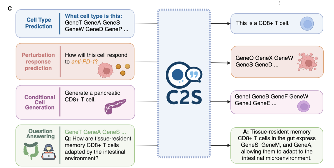이처럼 C2S-Scale은 세포의 언어를 이해하는 법을 배워, 이를 문맥적으로 해석하고 생물학적인 질문에 대해 답변할 수 있습니다. 이외에도 C2S-Scale이 수행할 수 있는 다양한 생물학적 태스크에 대해 살펴봅시다. |