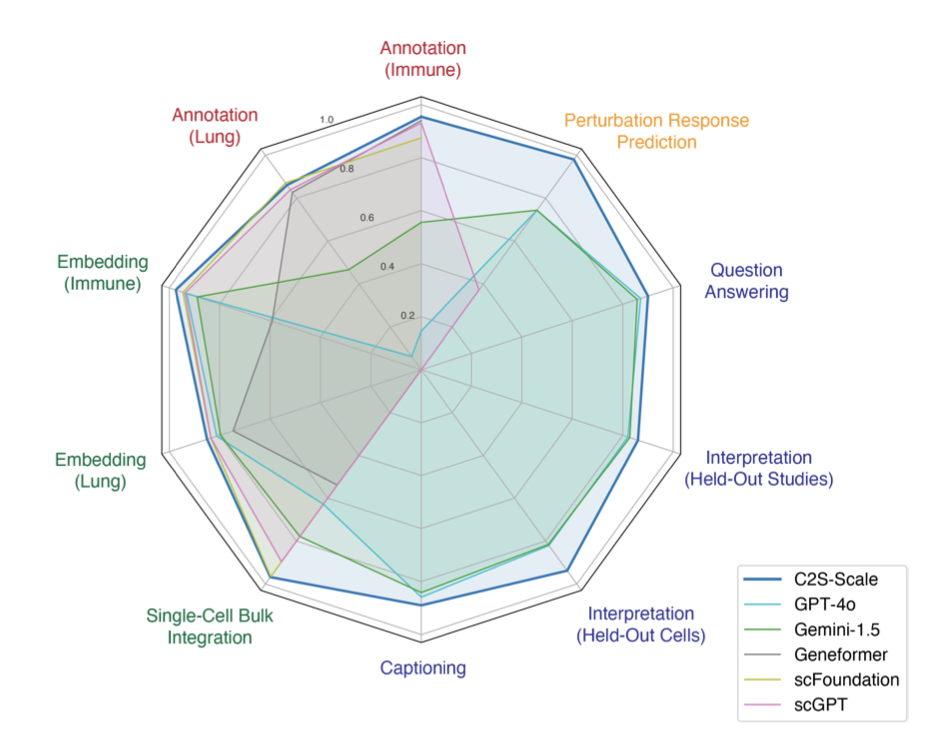 위 그래프에서 볼 수 있듯이 C2S-Scale은 다양한 생물학적 과제에서 기존 LLM들을 능가하는 성능을 보였습니다. 하지만 단순히 성능이 뛰어난 AI에 그치지 않고, 데이터 속에서 스스로 새로운 생물학적 패턴을 찾아낸 점에서 더욱 큰 의미를 갖습니다. AI가 인간의 연구를 보조하는 단계를 넘어, 직접 과학적 통찰을 만들어내는 주체로 발전하고 있는 것이죠.