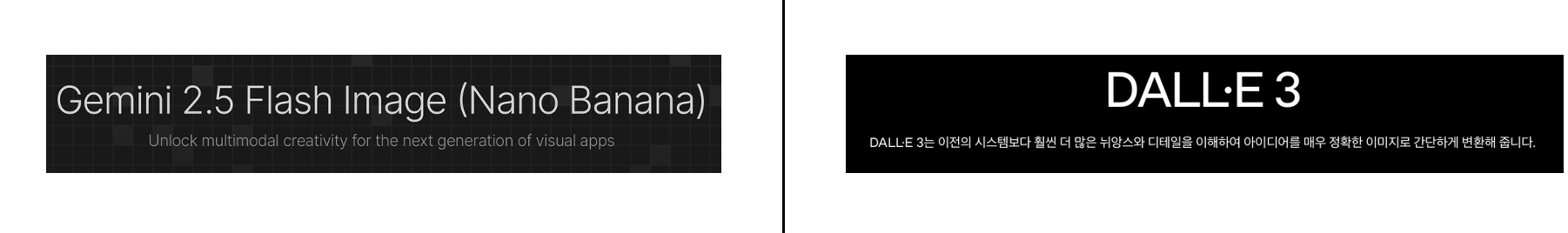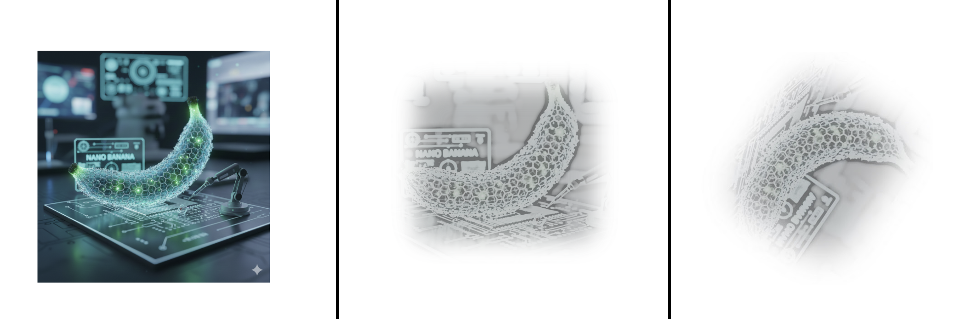 “NANO BANANA”라는 입력으로 만들어낸 AI 생성물(좌)과 단계별로 약한 변화(중)와 극단적 변화(우)를 준 이미지