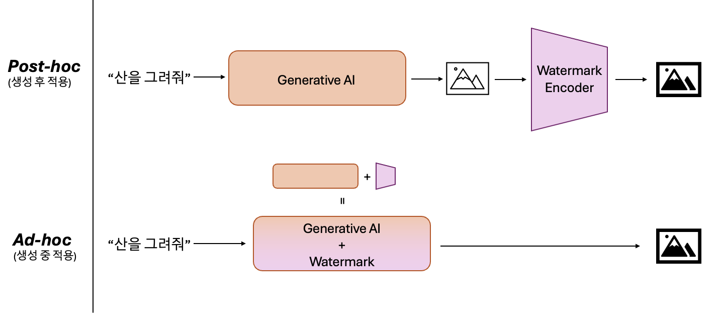 워터마킹 기술은 적용 시점에 따라 크게 'Ad-hoc(생성 중 적용)' 방식과 'Post-hoc(생성 후 적용)' 방식으로 나눌 수 있습니다.