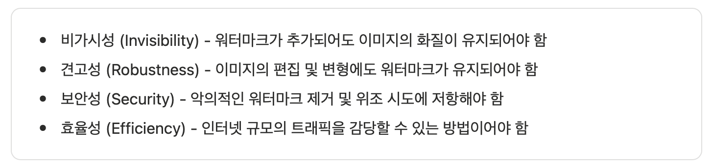 마지막으로는 효율성입니다. 워터마킹을 삽입하는 과정이나 검출하는 과정이 무거워서 지연이 된다면, 서비스의 품질이 저하되는 문제가 발생합니다. 생성형 AI의 모델 자체도 이미 추론 비용이 높은데, 워터마킹 과정이 병목을 더욱 일으키면 안되겠죠.