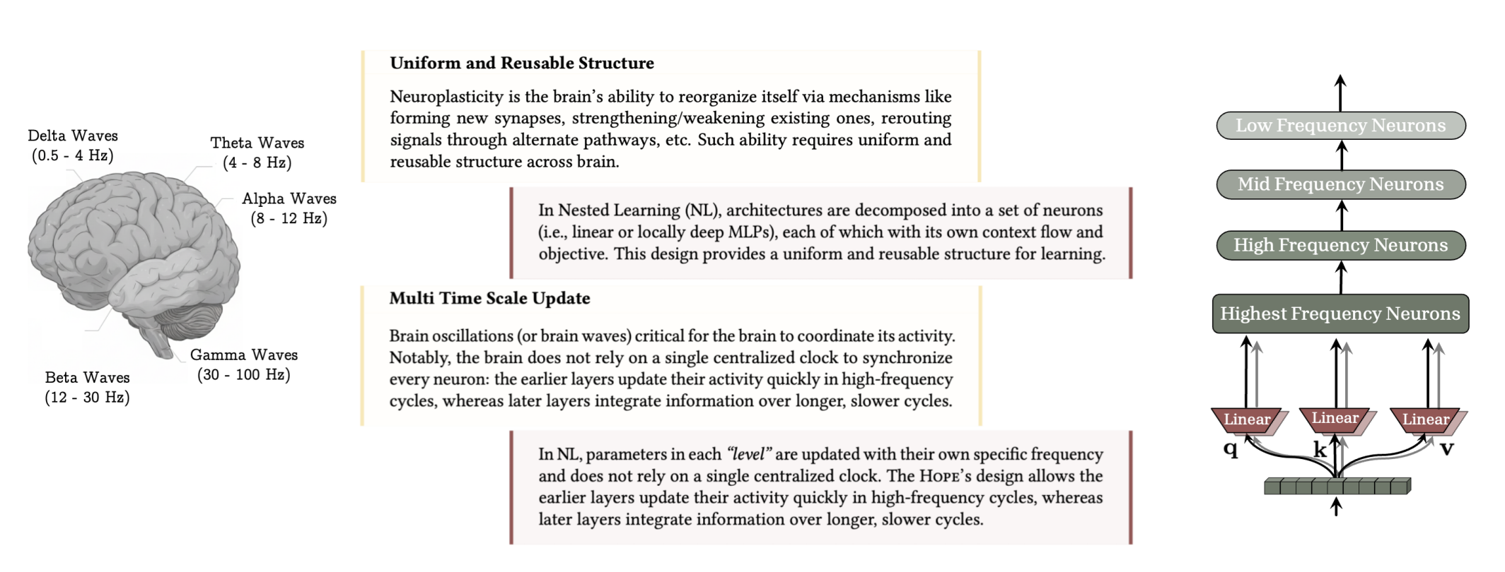 핵심 아이디어는 뇌의 기억 시스템에서 왔습니다. 뇌는 부위마다 정보를 처리하는 속도가 다릅니다. 해마는 밀리초(ms) 단위로 빠르게 변하며 단기 기억을 담당하고, 대뇌피질은 수면 중에 아주 천천히 변하며 장기 기억을 저장합니다. 이렇게 서로 다른 시간척도를 모델에 적용하여, 모든 변화를 하나의 파라미터 집합에 한 번에 반영하는 대신, 빠른 적응과 느린 통합을 분리하는 설계를 사용합니다.