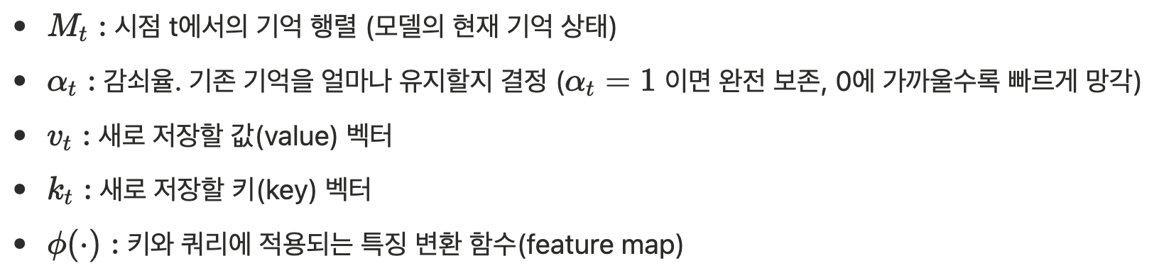Nested Learning 논문은 이를 연관 기억(Associative Memory)이라는 관점에서 정의합니다. 키 집합 K를 값 집합 V에 매핑하는 연산자 M(⋅)을 학습하는 것이 핵심이며, 이 매핑의 품질을 측정하는 목적함수 L̃ 에 대해 다음과 같이 정의됩니다. |