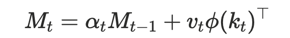 이 연관 기억이 실제로 작동하는 방식이 Fast Weight Programmer(FWP)입니다. 모델 안에 기억 행렬 M_t가 존재하고, 시점 t마다 새로운 데이터가 들어오면 이 행렬이 즉시 갱신됩니다. |