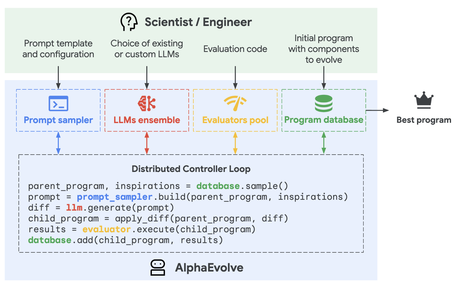 Google DeepMind 팀은 이 한계를 뛰어넘기 위해 2025년 6월, 새로운 코딩 에이전트 AlphaEvolve를 세상에 내놓았습니다. AlphaEvolve는 단순히 빈칸을 채우는 수준을 넘어서, 프로그램 코드 전체의 구조를 스스로 파악하고, 파일 전체를 통째로 생성하고 최적화합니다. 부분적인 수리가 아니라, 아예 새로운 설계를 제안하는 단계로 진화한 것입니다.